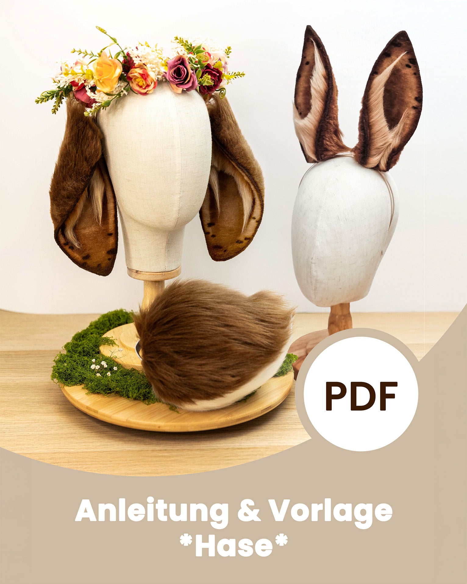Diese digitale Anleitung enthält eine allgemeine Schritt-für-Schritt-Erklärung sowie Vorlagen zum Ausdrucken und Ausschneiden für Cosplay-Ohren und ein Hasen-Schwänzchen.