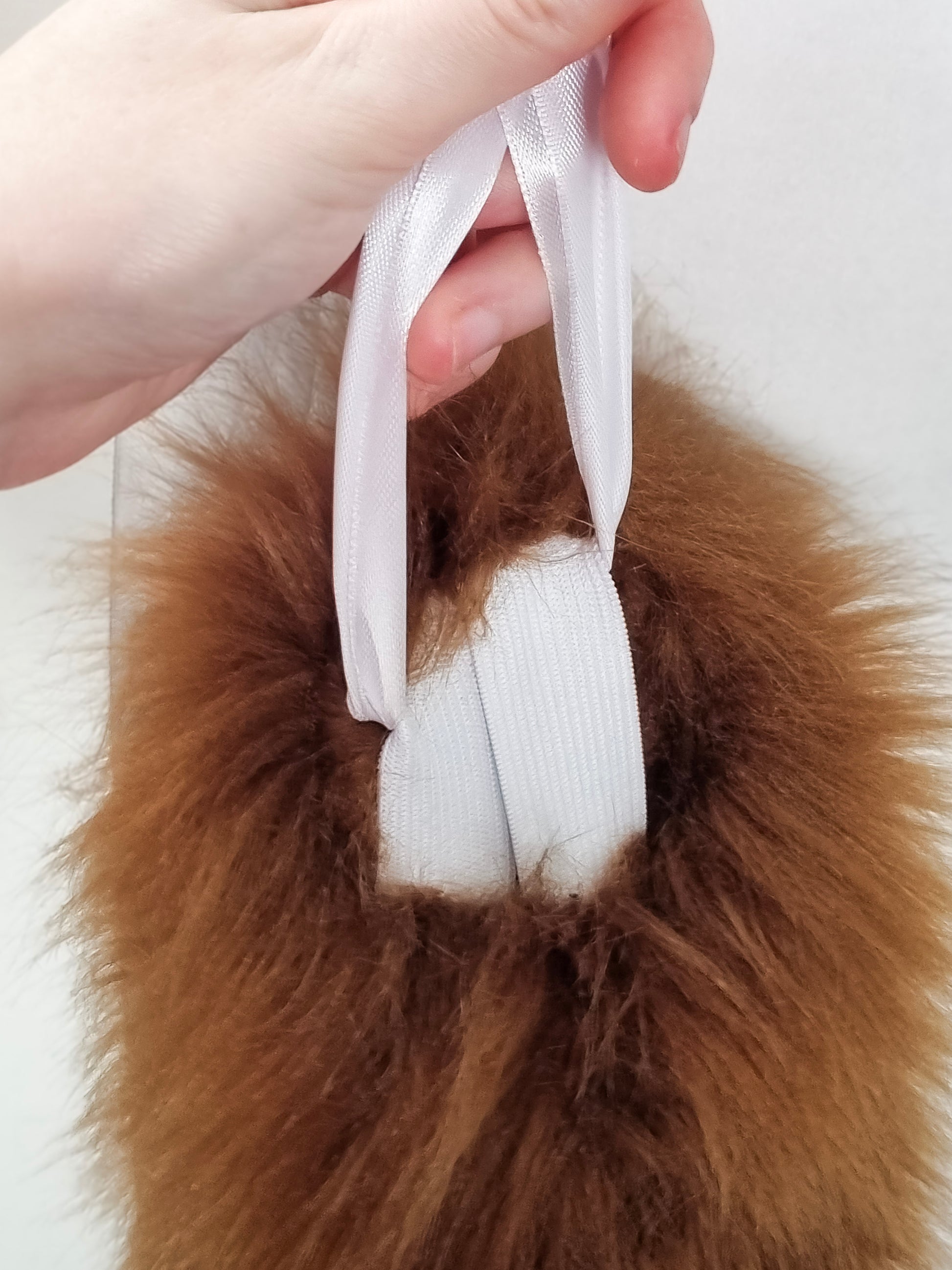 - Materialien: Kunstfell, Füllwatte (Polyester Mix), Gummiband, Schaumstoff, Satinband