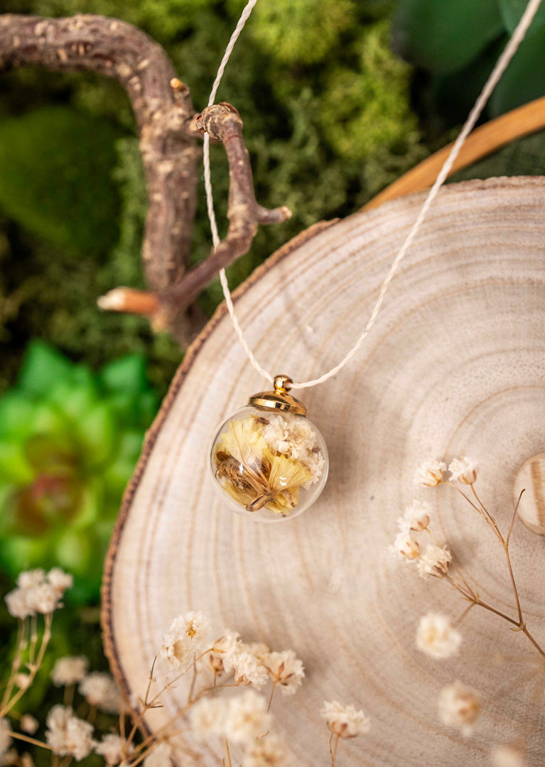 In dieser filigranen Glaskugel sind konservierte Trockenblumen und Moos eingefangen – ein kleines Stück Natur zum Tragen. Zart, magisch und voller natürlicher Schönheit. 🍃🔮