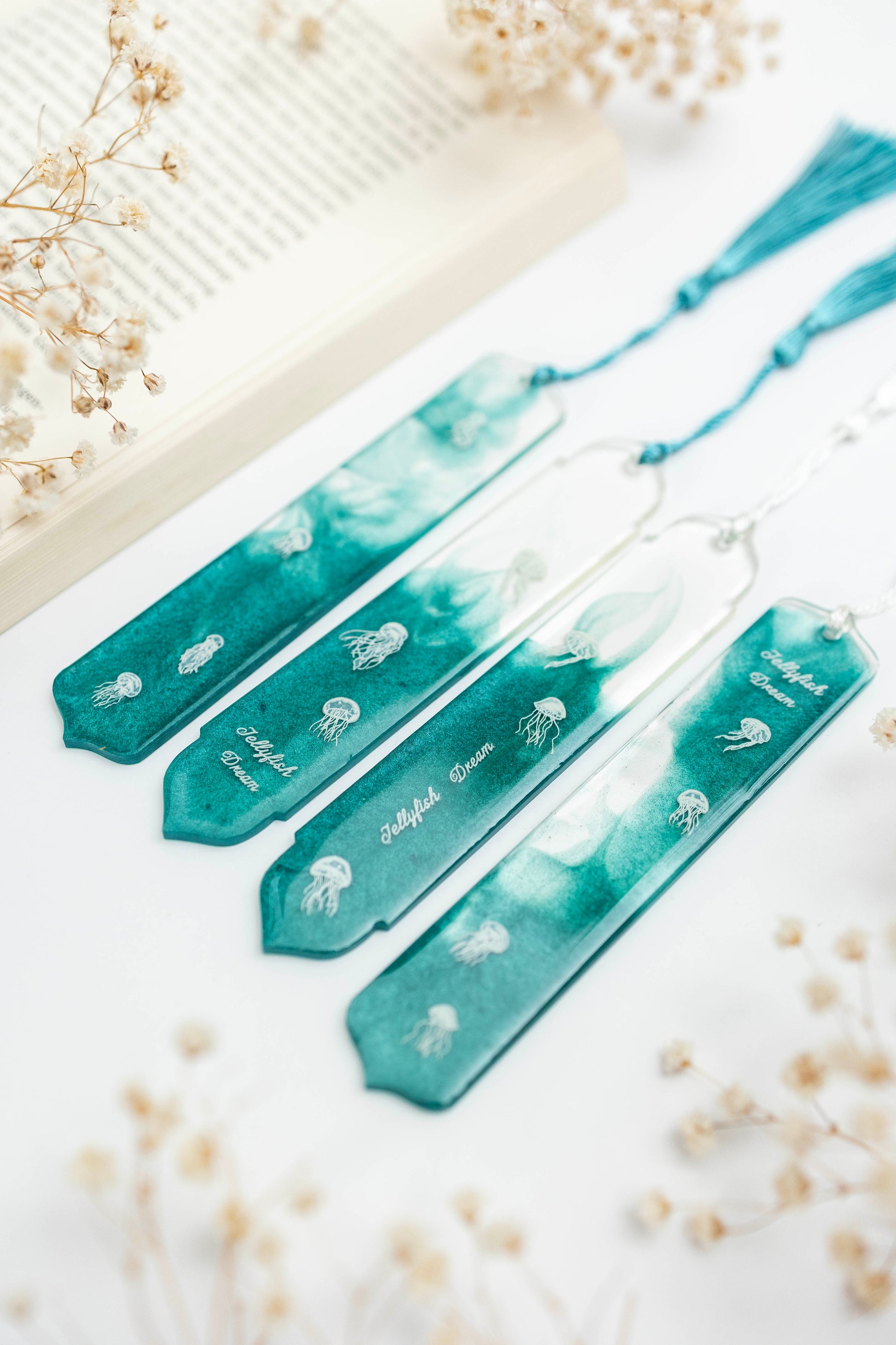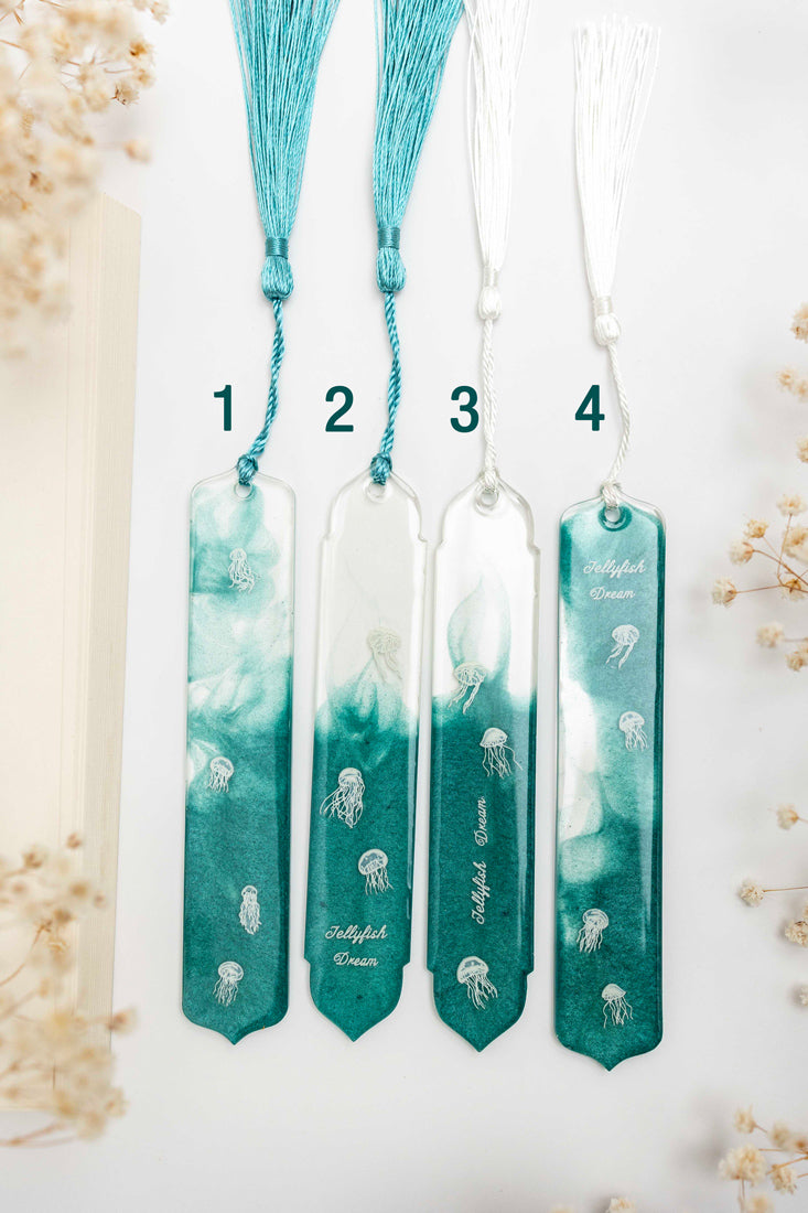 Handgefertigten Lesezeichen mit feinem Schimmer und Quallen verleihen jedem Stück eine mystische Leichtigkeit. Perfekt, um jedem Buch eine besondere Note zu verleihen. ✨📖