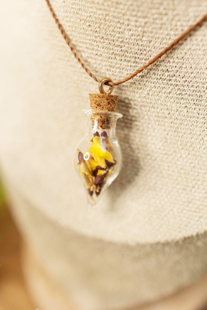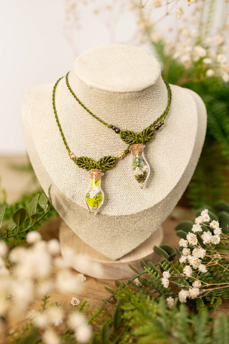 Diese handgefertigte Kette vereint die Eleganz eines schimmernden Glastropfens mit kunstvollen Makramee-Details und teilen echter Natur wie Moos und Trockenblumen. Ein magisches Schmuckstück, das Licht einfängt und deinen Look verzaubert! 🌿📿
